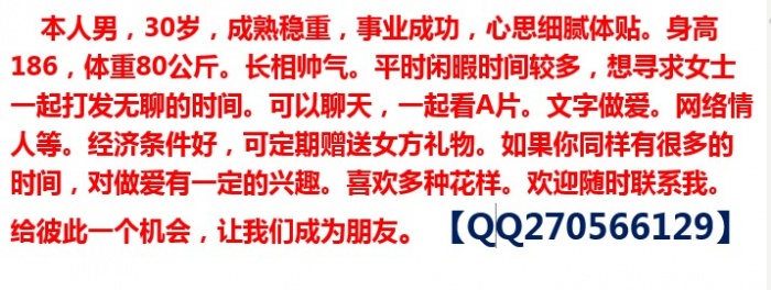 本人25,180,经常健身,身材还不错,然后研究生学历,刚毕业,500强工作,素质交友,愿和各位单女,性瘾患者,女M,欲求不满的少妇一起追求性福,qq or wx 807361712~