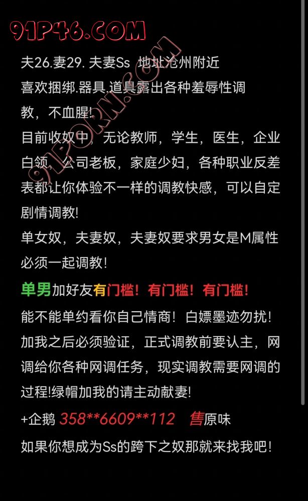 加我之后必须验证,正式调教前要认主,网调给你各种网调任务,现实调教需要网调的过程!绿帽加我的请主动献妻!