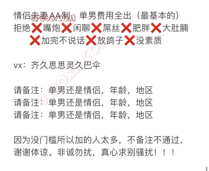 看好文字再加我行吗?备注写年龄,地区,是单男还是情侣?长相恶心的我求求别加我,搞得都没有心情了