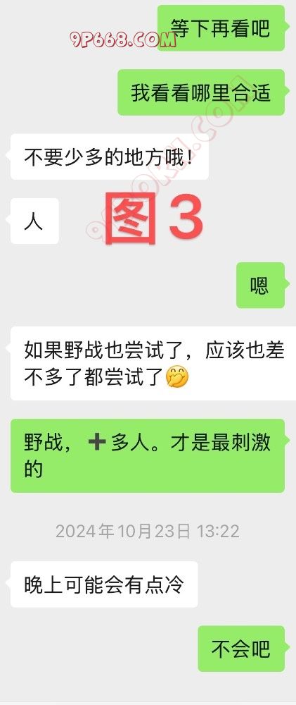 小湖北加上老婆微信后,我正愁着怎么让他们实战玩起来,恰逢来了一个千载难逢的时机。那段时间,老婆突然性欲暴涨,某天,老婆突然发微信给我问我去不去野战?我挺震惊,因为我们从来没这么玩过,更没想到居然是老婆主动提出来,这和她平时的性格完全相反。但是瞬间让我意识到这是让小湖北和老婆深入交流的绝好时机,于是我答应老婆去找地方野战,而且还鼓励她邀请找个单男加入,单男的人选就是上一次顶替我小号的那个人。并没有直接让她邀请小湖北。原因是她从未见过小湖北,直接让她约陌生人,被拒绝的概率很高。让她约其他单男没有合适人选。因为这一两个月当中她只和小号中的单男打的火热,描述起来很复杂,不知道各位能不能看懂?老婆欣然同意,为了让计划天衣无缝,当老婆在微信上问我小号要不要加入野战时,小号中的我肯定借故推脱,这样就创造了让小湖北加入的条件……(见图1、2、3)